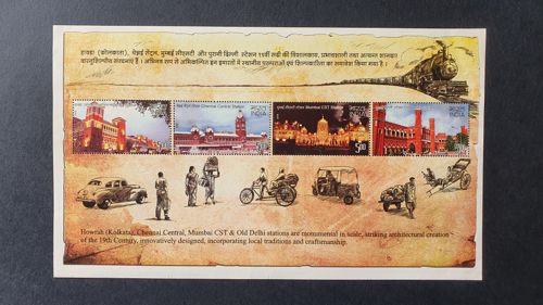 This is a commemorative philatelic miniature sheet issued by India Post, featuring four distinct postage stamps. The stamps individually depict historic 19th-century railway stations: Howrah (Kolkata), Chennai Central, Mumbai CST (Chhatrapati Shivaji Terminus), and Old Delhi. The sheet is printed on high-quality rectangular paper with a cream-toned, parchment-like background illustration. The overall design includes a vintage-style steam locomotive in the upper right corner and various traditional Indian transportation modes across the bottom, such as a vintage car, hand-pulled rickshaws, and an auto-rickshaw. The text is provided in both Hindi and English, describing the architectural significance of the stations. The stamps are intact with visible perforations, suggesting they are in mint, never-hinged condition. The colors are vibrant, primarily featuring reds, golds, and blacks, reflecting the grand Victorian-era architecture. There are no signs of foxing, creases, or corner blunting, indicating excellent preservation. The sheet serves as both a functional postal item and a piece of historical artwork celebrating Indian railway heritage.