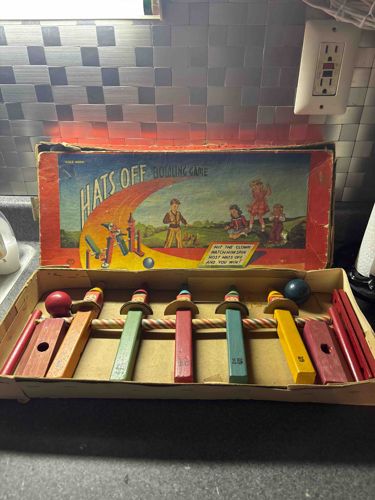 This is a vintage 'Hats Off' Bowling Game, a skill-based toy likely dating from the mid-20th century, approximately the 1940s or 1950s. The set is contained within its original lithographed cardboard box, which features vibrant mid-century illustrations of children playing outdoors. The game mechanics involve five wooden 'clown' or figure-style pins painted in distinct colors: yellow, green, red, teal, and orange. Each figure features a numbered score value (such as 10, 15, 20) stenciled on the base. A unique design element of this game is the horizontal cross-bar, decorated with a red-and-white 'barber pole' spiral, which supports the pins and allows them to rotate or 'flip' when struck. The set includes two solid wooden bowling balls, one red and one blue, along with additional wooden structural side-rails. The construction is primarily of painted wood and thick cardstock. Condition-wise, the item shows moderate vintage wear; there is visible scuffing and edge wear on the box lid, and the internal cardboard dividers show some sagging. The paint on the wooden figures remains largely intact with some minor chips consistent with age and use. The 'Trade Mark' text is visible on the inner lid, adding to its collectible provenance as an early Transogram product or similar era board game manufacturer.
