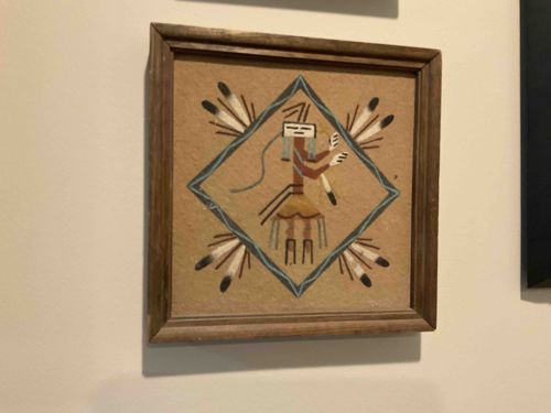 This is a native Navajo sandpainting depicting a Yeibichai or Yei figure, a spiritual entity in Navajo culture. The artwork is created using various colors of naturally dyed crushed sand and minerals applied onto a fiberboard or wood backing. The central figure is enclosed within a diamond-shaped border of blue and white 'rainbow' motifs, surrounded by four stylized feather bundles pointing towards the corners. The palette consists of earth tones including ochre, terra cotta, charcoal black, white, and a muted turquoise blue. The composition is highly symmetrical and traditional in style, likely dating from the mid-to-late 20th century (circa 1960s-1980s). It is housed in a simple, rustic dark wood frame with a visible grain that shows minor scuffing and wear on the edges. The sand surface appears well-preserved with no significant loss of material or 'shedding' visible, though some minor discoloration or fading from age is present. The craftsmanship displays the characteristic precision of traditional sandpainting, with fine lines and consistent texture. While no signature is immediately visible on the front, such pieces often have artist information or tribal affiliation on the reverse side. The item is decorative but holds cultural significance as an interpretation of sacred ceremonial motifs made for the commercial market.