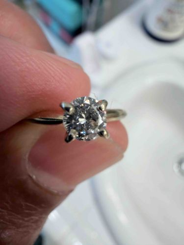 This item is a classic solitaire engagement ring featuring a single, prominent round brilliant cut diamond. The diamond is secured within a traditional four-prong setting, which is elevated to allow light to enter the stone from multiple angles, maximizing its brilliance and fire. The band is a slender, polished shank that appears to be crafted from white metal, likely 14k or 18k white gold or potentially platinum, though hallmarks are not visible in the provided view. The central diamond displays a noticeable depth of cut with visible facets that suggest a standard modern brilliant arrangement. Based on the visual scale against a finger, the stone likely weighs between 0.50 and 0.75 carats. Regarding condition, the metal shows a reflective, high-polish finish with no immediate evidence of deep gouges or structural deformation, though fine surface abrasions (patina from wear) are typical for this style. The prongs appear stout and well-aligned, securely gripping the girdle of the stone. The style is timeless and iconic of late 20th-century to contemporary jewelry design. There are no maker's marks visible on the exterior of the band, which is common as such stamps are usually located on the inner circumference. The overall craftsmanship suggests a quality commercial-grade piece of fine jewelry.