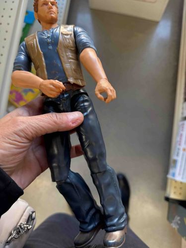 This is a large-scale action figure measuring approximately 12 inches in height, depicting actor Chris Pratt as the character Owen Grady from the Jurassic World film franchise. The figure is constructed primarily of injection-molded plastic with a matte finish. Owen is portrayed in his signature cinematic outfit, featuring a blue textured henley shirt, a tan utility vest with pocket detailing, dark blue trousers, and brown work boots with silver-painted accents. The head sculpt provides a stylized but recognizable likeness of the actor. The figure features basic articulation points at the neck, shoulders, and hips. Physically, the item shows signs of moderate play wear, including scuffing on the hair paint and slight paint loss on the boots. The plastic surfaces exhibit minor surface abrasions, particularly on the legs. There are no visible maker's marks or stamps in the current view, but such items typically feature Mattel and Amblin/Universal trademarks on the lower back or foot. Produced circa 2018 to coincide with 'Jurassic World: Fallen Kingdom', the craftsmanship is consistent with mass-market retail toys, prioritizing durability over high-end collector articulation.