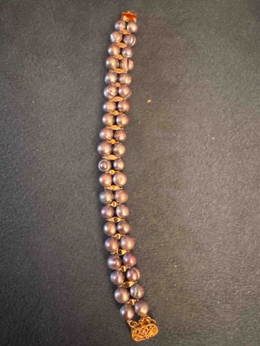 This elegant vintage-style bracelet features two parallel strands of baroque-shaped cultured pearls, likely freshwater in origin. The pearls exhibit a sophisticated grey to dusty-lavender metallic hue with visible iridescent overtones. Each pearl measures approximately 7mm to 9mm, displaying the characteristic irregularities and surface undulations typical of baroque pearls, which adds unique character and texture to the piece. The strands are separated and structuralized by small yellow-gold-tone spacers which appear to be diamond-shaped or faceted, alternating between each pearl to maintain alignment and prevent friction. The bracelet is finished with a prominent, decorative gold-tone box clasp featuring an intricate filigree or openwork floral design, providing a secure and aesthetic closure. In terms of condition, the pearls seem well-matched in color and luster, though there is some visible surface wear and minor scuffing consistent with age. The gold-tone finish on the metal components shows a slight darkening or patina, particularly in the recessed areas of the filigree clasp, suggesting mid-20th-century craftsmanship. No visible maker's marks are immediately apparent from this angle, but the quality of the stringing and the complexity of the clasp indicate a well-made piece of fine costume or semi-precious jewelry.