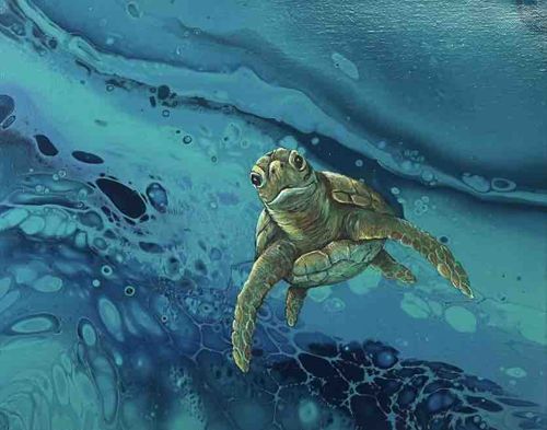 This original 11x14 acrylic painting on canvas depicts a green sea turtle swimming through a vibrant, stylized underwater environment. The artwork employs a sophisticated mixed-media approach, combining a 'fluid art' or 'pour painting' technique for the background with a detailed, representational style for the turtle itself. The background features a striking palette of cerulean, navy, and teal, with visible 'cells' and organic lacing patterns characteristic of acrylic pouring mediums, effectively mimicking the chaotic yet rhythmic movement of ocean currents and light refraction. The sea turtle is centrally composed, rendered in earthy greens, tans, and browns with fine detail on the scutes of its shell and the scales of its flippers. The turtle's expression is gentle and alert, providing a focal point against the abstract aquatic backdrop. The painting appears to be in excellent contemporary condition with no visible cracking, fading, or damage to the canvas surface. The artist's mastery of both abstract fluid dynamics and realistic wildlife rendering demonstrates high craftsmanship. This piece is a signature contemporary work that bridges the gap between modern abstract techniques and traditional marine life illustration.