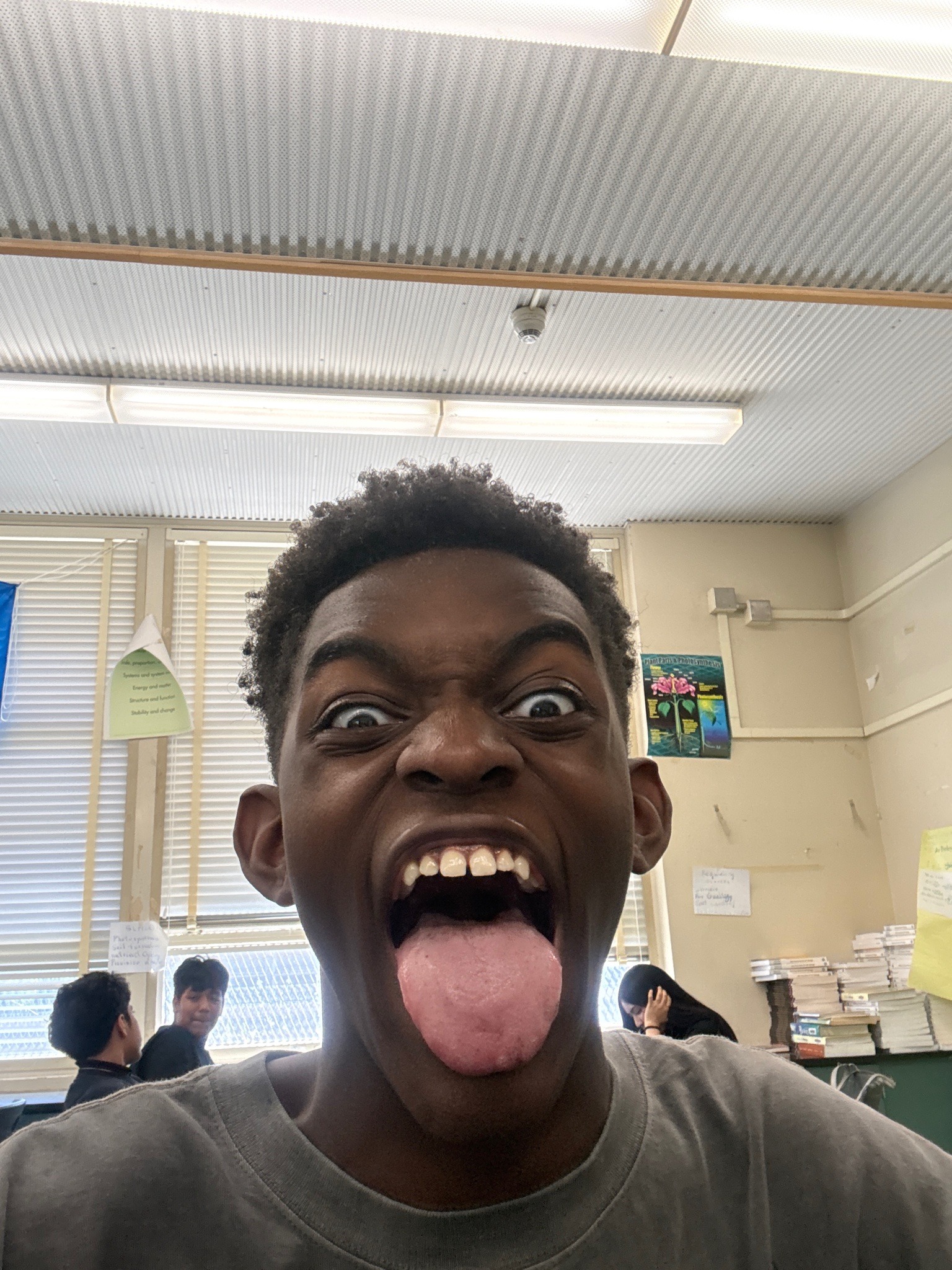 A vibrant digital color photograph captured from a low perspective, featuring a young male subject approximately 15 years of age centered in the foreground. The subject exhibits a wide-eyed, energetic facial expression with his tongue extended and mouth agape, conveying a sense of playful humor and spontaneity. The composition highlights anatomical details including the texture of the tongue and the structure of the upper teeth. He is wearing a simple grey cotton-blend crewneck t-shirt. The background provides a rich contextual setting of a contemporary classroom environment, featuring corrugated metal ceiling panels, fluorescent lighting fixtures, and large windows with horizontal blinds. Visible secondary elements include other students seated at desks, various educational posters regarding plant biology, and stacks of textbooks. The image quality is high, with sharp focus on the central subject's facial features and natural color saturation. The lighting is bright and even, likely a combination of indoor institutional lighting and diffused natural light coming through the blinds.