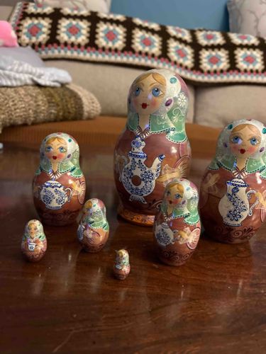 This is a hand-painted seven-piece wooden Matryoshka nesting doll set, featuring a coordinated theme across each descending scale. The dolls are constructed from carved linden or birch wood and finished with a glossy lacquer. Each figure depicts a stylized woman with large blue eyes, blonde hair, and a white and green floral headscarf (platok). The primary body color is a burnt sienna or reddish-brown hue. A distinguishing artistic element is the 'doll-within-a-doll' motif: each figure is painted holding a blue-and-white porcelain-style vessel, resembling Gzhel pottery, which varies from large teapots on the outer dolls to simple teacups on the smaller ones. Notable features include fine white filigree and scrolling gold-toned accents. The craftsmanship indicates a mid-to-late 20th-century Russian folk art style, likely from a specialized workshop given the consistency of the painting across the smaller pieces. Condition-wise, the set appears well-preserved with a high-gloss finish intact, though minor surface abrasions and horizontal seam lines are visible where the pieces pull apart. The smallest doll is diminutive, approximately 1 cm in height, showing remarkable detail for its scale. No visible maker's signature is apparent on the front, though such marks are traditionally located on the base of the largest doll.