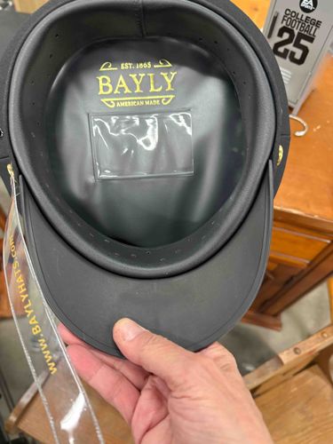 This is a contemporary, professional-grade uniform visor hat, commonly utilized by marching bands, police forces, or security personnel. The item is manufactured by Bayly, Inc., featuring a prominent gold-foil logo on the interior crown which states 'EST. 1865' and 'AMERICAN MADE.' This indicates a manufacturer with a long-standing heritage in headwear production. The hat's construction is primarily black fabric, likely a durable wool blend or high-performance synthetic, with a structured crown and a rigid black visor. The interior is lined with a smooth, synthetic moisture-wicking material and features a perforated sweatband designed for ventilation and comfort during extended wear. A clear plastic identification pocket is heat-sealed to the interior crown, allowing for easy labeling by the owner. The presence of a plastic manufacturer's tag still attached suggests that the item is in New Old Stock (NOS) or mint condition, showing zero signs of structural wear, fading, or perspiration stains. The craftsmanship is of high industrial quality, with precise stitching and reinforced pressure points. The external sides of the hat are adorned with gold-toned metallic buttons, used to secure a chin strap (not visible in this angle). Overall, this is a modern, high-quality uniform accessory intended for formal ceremonial or professional use.