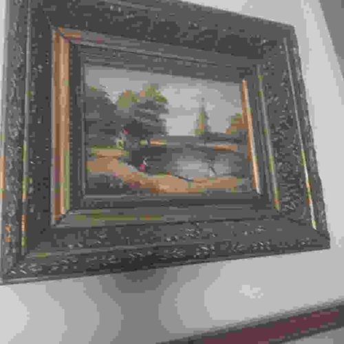 This item is a small-scale miniature oil painting executed on a wooden panel, housed in an ornate, deep-profile Barbizon-style frame. The artwork depicts a serene pastoral landscape featuring a body of water, likely a river or pond, flanked by lush green trees and what appears to be a small cottage or structure on the left bank. The color palette consists of earthy tones, including deep greens, ochres, and muted blues for the sky and water. The brushwork shows a level of fine detail consistent with 19th-century European miniature traditions. The frame is a significant component of the piece, featuring multi-tiered molding with intricate floral or acanthus leaf relief patterns finished in a dark, aged patina with subtle gold or bronze metallic highlights on the inner liners. The frame's construction suggests a late 19th to early 20th-century origin. Regarding condition, there is visible dust accumulation in the crevices of the ornate frame and minor surface abrasions consistent with age. No major cracks or warping of the wood panel are immediately apparent, though the varnish exhibits a slight dulling common in antique oil paintings. The craftsmanship indicates a professional hand, likely intended for a private study or a collector's 'cabinet of curiosities'.