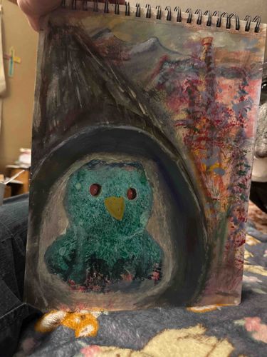 This item is an original piece of artwork executed in a spiral-bound sketchbook. The medium appears to be a mixed media approach, likely combining acrylic or gouache paints with some oil pastel or crayon detailing. The composition features a central, stylized teal or turquoise owl with red eyes and a yellow beak, nestled within a dark, cave-like arch or tree hollow. The background consists of a sweeping, dark triangular form to the left, possibly a mountain or architectural structure, while the right side depicts an expressive, vertical red and purple flowering form against a hazy sky. Physically, the work is roughly 9x12 inches, typical for medium artistic sketchpads. The craftsmanship is expressive and folkloric in style, prioritizing color and texture over realistic precision. The paper shows slight buckling from moisture absorption during the painting process and minor curling at the bottom edge. There are no visible signatures or maker's marks on the front surface. Based on the material and style, it is likely a contemporary amateur or student work, possibly from the last 10-15 years. The color palette is vibrant, using Impressionistic dabs of paint to create the floral textures on the right, which contrasts with the flat, smooth application of color on the owl and the somber, dark tones of the surrounding hollow.