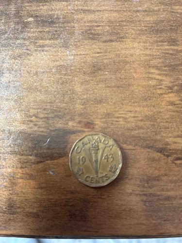 This is a 1943 Canadian 5-cent piece, commonly known as the 'Victory Nickel.' The coin is struck in Tombac, a copper-zinc alloy (88% copper, 12% zinc) introduced during WWII to conserve nickel for the war effort. It features a unique 12-sided (dodecagonal) shape, designed to distinguish it from the bronze cent. The reverse side prominently displays a central torch representing victory, flanked by the split date '19 43' and two small maple leaves. The word 'CANADA' is arched at the top, while 'CENTS' is at the bottom. A notable design feature is the Morse code message 'We Win When We Work Willingly' inscribed on the inner rim, though wear has softened the visibility of these elements on this specimen. The coin exhibits a dull, yellowish-brown patina characteristic of aged Tombac. Condition-wise, it appears to be in 'Circulated' or 'Very Good' (VG) grade; there is significant flattening of the torch details, rounded lettering, and surface scratches/scuffs. The edges show softened corners from decades of friction. While a common wartime issue, its distinct geometric shape and symbolic design make it a historically significant piece of Canadian numismatics.
