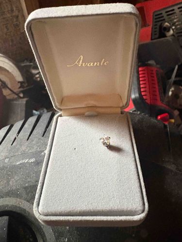This item consists of a single solitaire stud earring presented within an original hinged jewelry box. The earring features a clear, brilliant-cut colorless stone, which appears to be approximately 0.5 to 1.0 carat in size, secured by a multi-prong basket setting likely made of white gold or sterling silver. The presentation box is a rectangular, clamshell-style container with a light gray or off-white velvet-textured exterior and a matching fabric-lined interior. The inner lid is silk-lined and features the brand name 'Avante' printed in a gold-toned, cursive script. The box shows signs of light handling, while the earring appears structurally sound with no immediately visible damage to the facets of the stone or the metal mounting. The style is classic and minimalist, likely dating from the late 20th century to the present. While the brand 'Avante' is often associated with high-quality cubic zirconia or costume jewelry, the craftsmanship of the setting suggests a standard mass-market jewelry piece. The background shows a dusty workshop environment, which contrasts with the delicate nature of the jewelry item.
