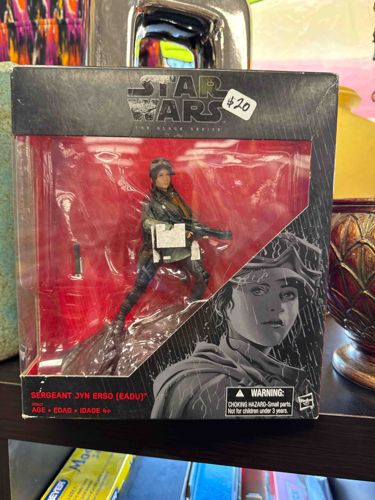 This is a mass-produced 6-inch scale action figure from Hasbro's highly detailed 'The Black Series,' representing the character Sergeant Jyn Erso in her Eadu planet outfit from the 2016 film 'Rogue One: A Star Wars Story.' The figure is constructed of injection-molded plastic with multiple points of articulation, featuring a likeness based on actress Felicity Jones. The ensemble includes a grey and brown tactical jacket, breathing apparatus, and a collapsible blaster rifle accessory. The packaging is the standard black and red window-box style characteristic of the line's third phase (2015-2020), featuring grayscale character artwork on the bottom right. The figure remains in its original interior plastic blister tray, though the external box shows visible shelf wear. Notable condition issues include significant corner dings, edge whitening, and a small puncture/tear on the top flap. There is a white price sticker marking the item at $20 and a secondary white sticker partially obscuring the figure inside the window. This specific release is numbered as #25 in the series and was manufactured around 2016. While the craftsmanship is typical of modern retail collectibles with digital face-printing technology, the secondary market value is currently impacted by the heavy box damage and original retail overstocking of this particular character.