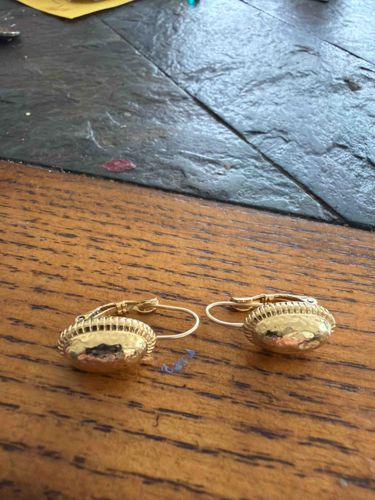 This is a pair of vintage fashion earrings from the renowned costume jewelry house, Monet. The earrings feature a prominent oval-shaped focal point with a highly reflective, hammered texture finish, which provides a multi-faceted light-reflecting quality reminiscent of artisan metalwork. The perimeter of the oval is accented with a delicate beaded or 'milgrain' border, adding a touch of classical sophistication to the design. Constructed from a high-quality gold-plated base metal, these earrings utilize a leverback closure mechanism, a hallmark of more secure and comfortable high-end costume jewelry. The style is indicative of the late 20th century, likely the 1980s or 1990s, when bold gold-tone statement jewelry was a staple of the Monet brand. While the specific maker's mark is not visible in the low-angle photograph, the brand attribution indicates a signature 'Monet' stamp would typically be located on the leverback arm or the reverse of the oval drop. The condition appears excellent with no visible tarnishing, pitting, or wear to the gold plating, suggesting minimal use and well-maintained storage. The craftsmanship is consistent with Monet's reputation for triple-plating, which ensures a long-lasting finish and a weight that mimics fine jewelry.