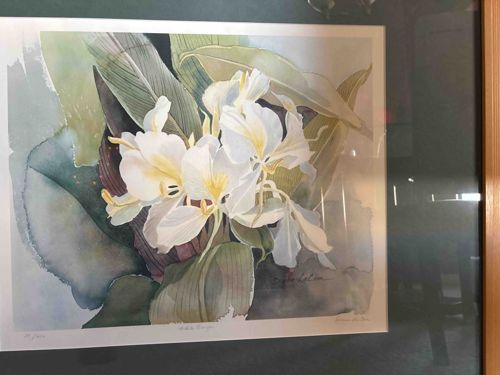 This is a framed, limited edition botanical print titled “White Ginger” by the artist Sophie de L’Eau. The artwork utilizes a watercolor-style technique, featuring delicate white ginger blossoms with subtle yellow centers, surrounded by lush green foliage and broad tropical leaves in soft tones of sage and emerald. The composition is balanced and illustrative, likely dating from the late 20th century. The piece is a lithograph or high-quality art print on white paper, featuring a visible white border with penciled annotations. On the lower left, the edition number is noted, though partially obscured in the image. Centered below the image is the title “White Ginger,” and the lower right corner bears the artist’s signature, “Sophie de L’Eau,” which matches the cursive signature found within the lower right quadrant of the image itself. The print is professionally matted with a dark, possibly forest green or charcoal, mat board that provides a deep contrast to the light floral subject. It is housed in an light-toned wood frame with clean, modern lines. The overall condition appears excellent; the colors remain vibrant with no signs of fading, foxing, or water damage visible to the paper. The glass is clear, though some surface reflections are present in the photograph. This piece demonstrates fine craftsmanship in both the print reproduction and the archival presentation, typical of high-end decorator art from the 1980s or 1990s.