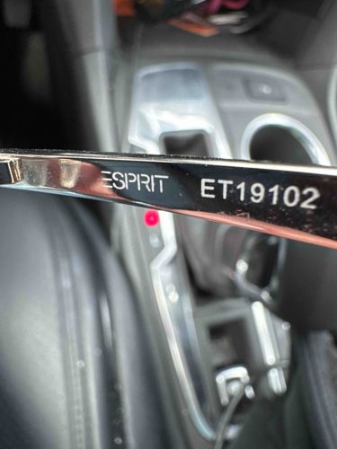This item is an inner temple piece from a pair of eyeglasses frames manufactured by the fashion brand Esprit. The component is constructed from a dark, likely black or deep navy, polished acetate or high-grade plastic material. The inner surface features distinct, crisp white printed markings including the brand name 'ESPRIT' in its signature uppercase sans-serif font, followed by the specific model number 'ET19102'. The construction appears to be a modern full-rim or semi-rimless design, characteristic of contemporary eyewear styles from the late 2010s to early 2020s. Physically, the temple exhibits a gentle taper and a smooth, glossy finish typical of mass-produced designer lifestyle eyewear. Visible condition indicators include minor surface dust and light micro-scratches consistent with regular wear and storage. There are no signs of significant structural damage such as stress fractures or logo fading, though some light fingerprinting and skin oil smudge is present on the reflective surface. The craftsmanship is industrial and precise, using heat-stamped or screen-printed lettering on a machine-finished frame arm.