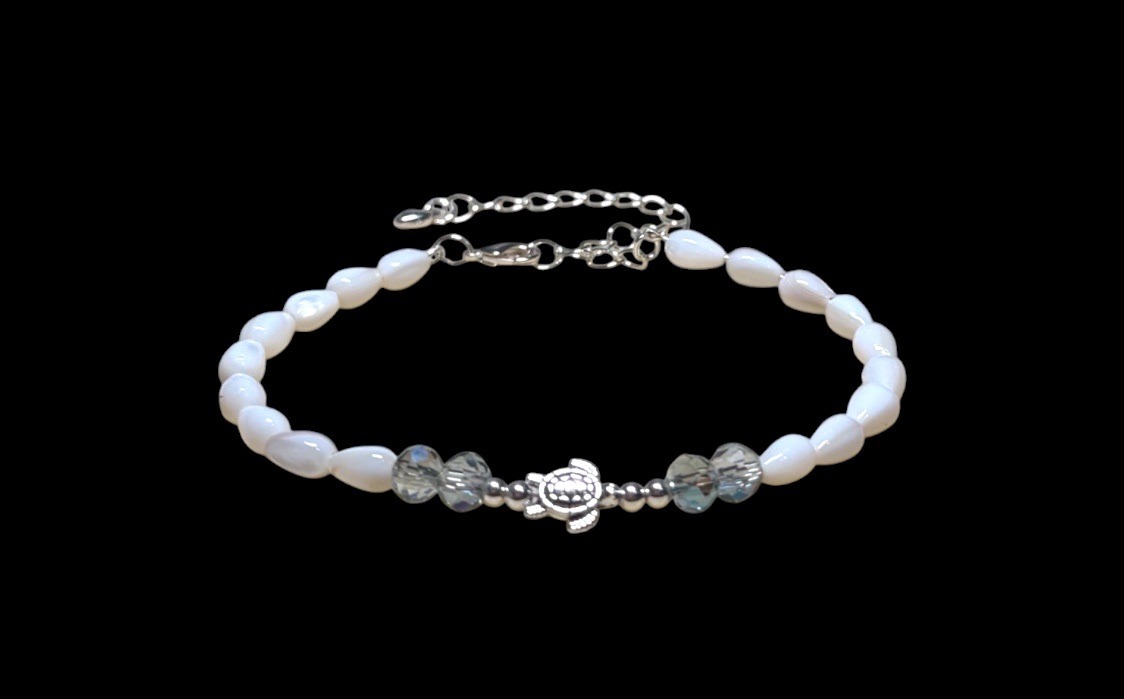 This is a contemporary beaded bracelet featuring a balanced, symmetrical design centered around a small silver-toned sea turtle charm. The primary body of the bracelet is composed of polished, teardrop-shaped white mother-of-pearl (nacre) beads, which exhibit a soft, iridescent luster characteristic of organic mollusk shell. Flanking the central turtle charm are two small metallic silver spacer beads, followed by two faceted clear crystal rondelles on each side that appear to have an aurora borealis (AB) coating, providing subtle flashes of color. The turtle centerpiece is rendered in a stylized, low-relief metallic finish. The construction utilizes high-tensile jewelry wire, finished with a silver-toned lobster claw clasp and a matching 1-2 inch extender chain for an adjustable fit. The item appears to be in new, pristine condition with no visible scratches on the crystal facets, no chipping of the nacre, and no discoloration of the metal components. Its style is indicative of modern coastal or nautical-themed fashion jewelry, likely contemporary mass-produced or boutique handcrafted rather than fine jewelry. The craftsmanship is clean and uniform, appropriate for costume or fashion accessory markets.