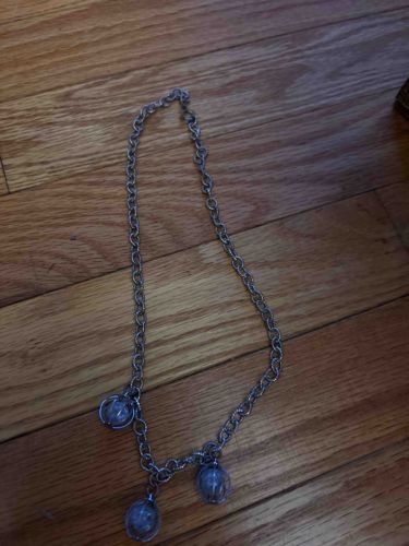 This item is a contemporary silver-tone costume jewelry necklace featuring an interwoven chain construction. The chain appears to be a double-link or textured cable style, likely made of a base metal alloy with a polished silver-colored plating. It features three prominent spherical charms suspended from the lower section of the chain. Each charm consists of a translucent, slightly frosted or iridescent glass marble enclosed within a cage-like wire structure or 'orb' frame, which is characteristic of modern celestial or whimsical jewelry styles. The metal shows a consistent cold sheen, suggesting it is a commercial-grade fashion accessory rather than high-end artisan silver. In terms of condition, the item appears intact with no visible breaks in the chain links, though the surface shows light micro-scratches consistent with gentle wear. There is no immediate evidence of heavy oxidation or green corrosion. The overall length is estimated to be approximately 18 to 20 inches, sitting mid-chest. While no maker's marks are visible in the photograph, the style and finish are representative of mass-produced boutique fashion accessories from the early 21st century (circa 2000-2015). The craftsmanship is standard for fashion jewelry, utilizing jump rings to secure the pendants.