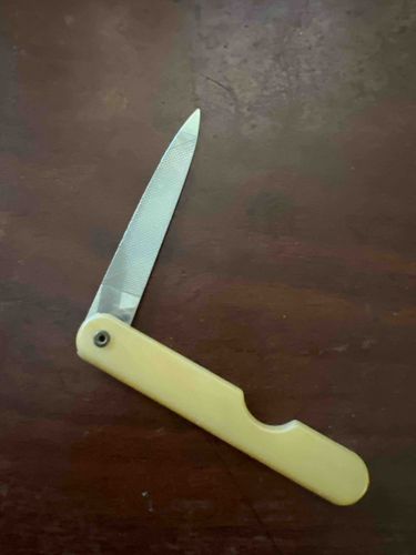 This item is a mid-20th-century folding pocket nail file. It features a hardened stainless steel file blade with a dual-sided cross-hatched abrasive texture and a pointed tip designed for nail cleaning. The handle is constructed from a creamy, off-white synthetic material, likely celluloid or an early phenolic resin (Bakelite variant), common in vanity accessories from the 1930s through the 1950s. The handle scales are secured by a single metal pivot pin that allows the blade to rotate 180 degrees. A distinctive semicircular cutout resides in the handle to facilitate easy deployment of the file blade. Regarding condition, the metal shows minor surface oxidation and light scratching consistent with age and occasional use. The handle material exhibits a warm aged patina but appears free of major cracks or 'celluloid rot,' though there is subtle darkening around the pivot pin. The construction is utilitarian but solid, typical of mass-produced personal grooming tools distributed by pharmacy brands or included in travel vanity kits. No specific maker's mark is visible in the current orientation, though such items were frequently produced in cutlery centers like Sheffield, England, or Solingen, Germany.