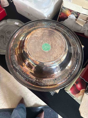 This is a vintage silver-plated round bowl, likely intended as a decorative centerpiece or bread basket. The item features a wide, flared rim with intricate reticulated or pierced metalwork in a repeating architectural arch pattern. The outer edge is finished with a gadrooned or rope-style border. The bowl appears to be constructed of silver-plated brass or copper, exhibiting a distinct yellowish-brown tarnish or 'patina' across the interior surface and portions of the exterior, which suggests significant oxidation of the silver layer or wear through to the base metal. There is a central green circular adhesive label on the interior base, which typically indicates a mid-20th-century retail or inventory tag. The craftsmanship shows standard commercial quality of the mid-century period, likely dating between the 1940s and 1970s. Overall condition shows heavy surface oxidation and potential pitting, requiring professional polishing to restore its original luster. No visible manufacturer stamps are immediately apparent through the tarnish, but the style is consistent with American or English silver-plate manufacturers from the mid-century era.
