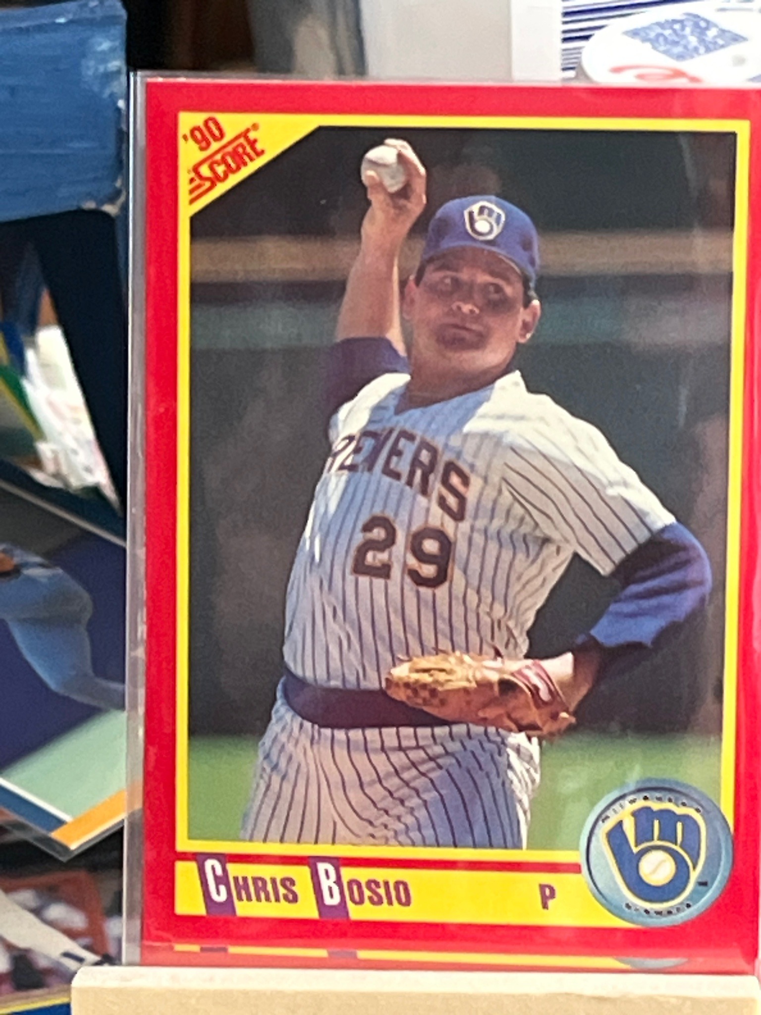 This is a standard-sized 2.5 by 3.5-inch sports trading card featuring pitcher Chris Bosio of the Milwaukee Brewers. Part of the 1990 Score baseball set, the card features a vibrant color palette typical of the early 'junk wax' era, with a thick red outer border surrounding a thinner yellow inner frame. In the top-left corner, the '90 Score' logo is displayed in yellow and red. The bottom of the card includes a purple title bar with the player's name in white and yellow block lettering, along with a circular Milwaukee Brewers 'ball-in-glove' logo in the lower right corner. The central photograph shows Bosio in mid-pitch wearing the classic pinstriped Brewers home uniform. The card appears to be in a protective plastic sleeve, which has preserved many of the sharp physical characteristics. The corners look relatively crisp through the sleeve, though the centering appears slightly shifted toward the right side. The colors remain saturated without visible fading. Produced by Major League Marketing, these cards were mass-manufactured during a peak in card production, making them widely available today. The card's condition is a primary factor in its appraisal, with particular attention to the integrity of the red borders, which are prone to showing white chipping or edge wear.