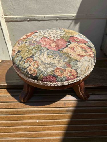 This is a vintage circular footstool featuring a padded top upholstered in a multi-colored floral tapestry fabric. The textile displays a variety of blooms including large roses and hydrangeas in shades of dusty rose, sage green, cream, and muted yellow against a dark background, characteristic of mid-20th-century traditional home decor. The edges of the upholstery are finished with a white decorative gimp or braid trim. The base is constructed of medium-toned wood, showcasing four short, stout cabriole-style legs with carved details. The legs show significant signs of wear, including visible scuffs, scratches, and loss of finish, particularly near the feet, suggesting it has seen considerable use. The fabric appears slightly faded with some light fraying near the trim, but the padding remains seemingly plump and functional. The overall craftsmanship is indicative of a mass-produced yet sturdy household piece, likely dating from the 1940s to the 1960s, reflecting a revival of Victorian-era furniture styles. This piece serves as a functional accent furniture item typical of domestic living room sets of that era.