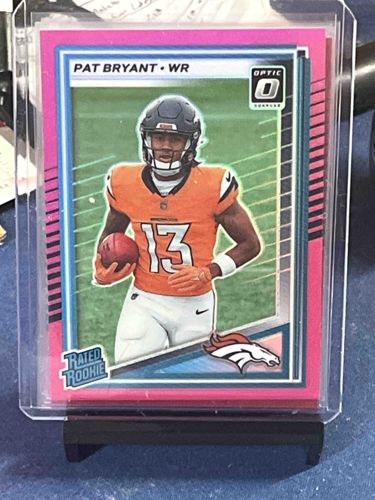 This is a contemporary standard-sized sports trading card featuring American football player Pat Bryant, identified as a Wide Receiver (WR) for the Denver Broncos. The card belongs to the Donruss Optic 'Rated Rookie' series, a highly popular subset among modern collectors. It features a distinct magenta or pink vibrant border, indicating it is likely a 'Pink Parallel' variant, which is typically found in retail-exclusive value packs or 'blisters.' The central imagery depicts Bryant in his orange Broncos jersey, carrying a football against a stylized green background with white action lines. Key branding elements include the 'Optic Donruss' logo in the top right, the iconic 'Rated Rookie' badge in the bottom left, and the Denver Broncos primary logo in the bottom right corner. The card is constructed from premium chrome-finished cardstock, giving it a reflective, high-gloss surface. It is currently housed in a clear protective plastic top-loader, which has preserved its condition. Observed from the photo, the centering appears relatively balanced, though a slight top-to-bottom bias may be present. The corners and edges, as viewed through the case, appear sharp with no immediate evidence of whitening, chipping, or surface scratches, suggesting a 'Near Mint' to 'Mint' state. The back of the card, while not visible, would contain career statistics and biographical data. This modern collectible captures the early professional career of the player during the current era of high-production, high-finish sports memorabilia.