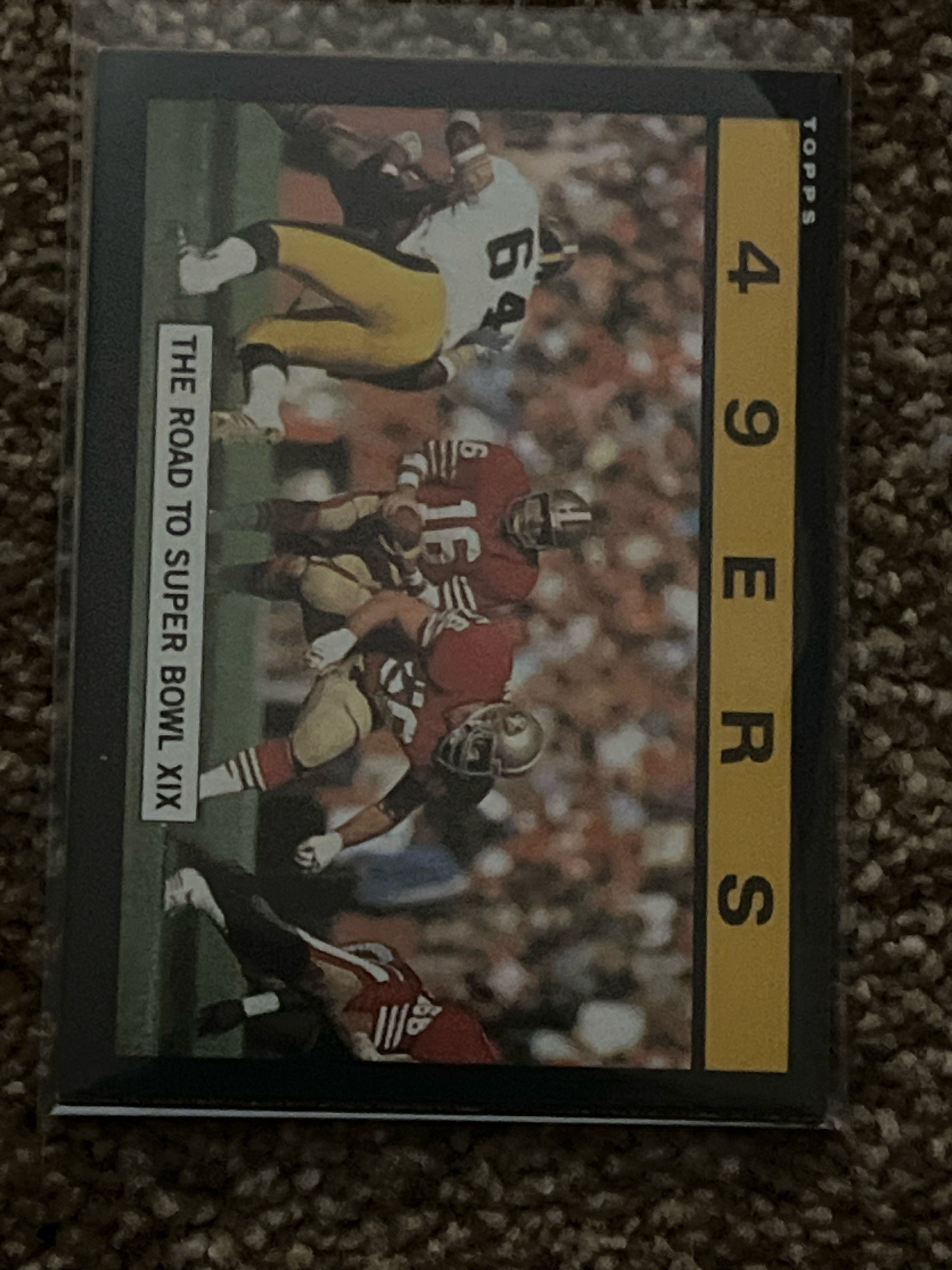 This is a vintage 1985 Topps football trading card featuring the San Francisco 49ers, titled 'The Road to Super Bowl XIX'. The card utilizes a horizontal orientation and measures the standard 2.5 by 3.5 inches. The design displays a distinct black border, which is notoriously difficult to find in high grade due to its tendency to show edge wear and chipping. On the right side, there is a bold yellow vertical banner featuring the team name '49ERS' in black block lettering. The 'TOPPS' logo is visible in the upper right corner. The central image is an action shot featuring Joe Montana (numbered 16) under center, appearing to hand off or take a snap, representing the team's successful 1984 season championship run. Physically, the card appears to be in a protective plastic sleeve. The centering appears slightly shifted toward the bottom/left edge. The black borders seem relatively intact in this view, though some minor white speckling or chipping might be present upon closer physical inspection of the edges and corners. This card is a significant piece of 1980s sports memorabilia, commemorating one of the most dominant teams in NFL history.