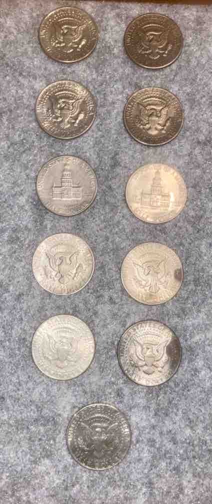 This is a collection of eleven United States Kennedy Half Dollars, displayed in two vertical columns with one coin centered at the base. Most of the coins feature the standard reverse design showing the Presidential Seal—a heraldic eagle with a shield, clutching an olive branch and arrows, surrounded by a ring of stars. Notably, the third row down displays two Bicentennial Half Dollars (minted 1975–1976), which feature the special reverse design of Independence Hall in Philadelphia. The coins appear to be struck from standard copper-nickel clad material, though some exhibit varying degrees of toning and surface oxidation. The top coins show a deeper, brownish-bronze patina, while the middle and lower coins appear more silvery with scattered dark spots and milk spotting. There are visible signs of circulation including minor surface abrasions, contact marks (bag marks), and edge wear. The strikes appear to be of business-strike quality rather than proof, indicated by the matte-like luster rather than a mirrored finish. The coins are resting on a grey, textured felt or fabric surface which is commonly used in numismatic display trays.