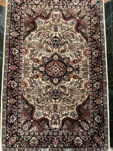 This is a rectangular hand-knotted area rug featuring a classic Persian design, characteristic of the Isfahan or Tabriz traditions. The central composition consists of a concentrated eight-pointed star medallion anchored on a double-scalloped ivory cream field. This field is densely populated with intricate 'Shah Abbasi' floral motifs, intertwining vines, and palmettes. The color palette is sophisticated and muted, primarily utilizing cream, deep burgundy (oxblood), charcoal black, and accents of dusty blue or slate grey. The rug is framed by multiple border layers, including a wide primary border with repeating floral cartouches flanked by narrower decorative guard borders. Based on the tight knotting density visible in the clarity of the patterns, it appears to be of high quality, likely constructed from a fine wool pile on a cotton or silk foundation. The fringe is visible at the bottom edge, appearing intact and white. The overall condition looks excellent with no visible threadbare patches, significant fading, or staining. The symmetry and precision of the curvilinear patterns suggest mid-to-late 20th-century craftsmanship. The edges appear straight and well-bound, indicating it has been well-maintained without significant fraying or structural damage.