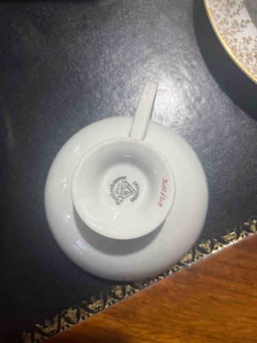 This item is a vintage porcelain teacup, specifically the underside view showing its base and characteristic backstamp. It is crafted from fine white hard-paste porcelain, a material renowned for its translucency and durability. The cup features a traditional footed base with a circular rim that elevates the body. The porcelain body is finished in a high-gloss white glaze, which appears largely intact with minor surface scuffing visible on the unglazed resting rim of the foot. The handle is slender and rectangular in profile, attached to the upper side of the vessel. A crucial identifying feature is the black backstamp within the footed circle, which reads 'Rauhenhammer Bavaria Germany' surrounding a stylized 'RJ' monogram inside a shield; this logo was used by the Porzellanfabrik Rauhenhammer (founded by Friedrich Christian Paul Müller) in the mid-20th century. Additionally, there is a hand-painted red numerical mark '672/2076' on the side of the foot rim, likely indicating a specific decorator pattern or production series number. The condition appears fair to good, with some darkening on the interior of the foot ring suggesting light use. The overall craftsmanship reflects the high standards of post-war German porcelain production, specifically from the Upper Franconia region of Bavaria. Based on the style of the mark, this piece likely dates from the 1950s or 1960s.
