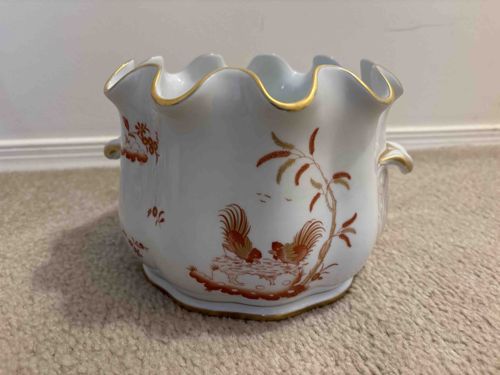This is a fine porcelain cachepot manufactured by the renowned Italian firm Richard Ginori, featuring the iconic 'Galli Rossi' (Red Roosters) pattern. The vessel is constructed from a high-fire white glazed porcelain with a heavy, substantial build. Its most striking physical characteristic is the deeply scalloped or ruffled rim, which is meticulously hand-gilded with a thick gold band. The body is bulbous with two integrated gilded scroll handles on the sides. The decoration consists of iron-red and gold Chinoiserie-style motifs, specifically depicting two stylized roosters engaged in a central scene amidst oriental flora and delicate bamboo-like branches. The painting showcases a high level of craftsmanship with fine line work and varying tonal intensities in the iron-red pigment. Regarding condition, the piece appears in excellent vintage to modern state with the white glaze retaining high luster and no visible cracks or chips. The gilding on the rim and handles shows minimal wear, suggesting it has been well-maintained. This pattern is a revival of an 18th-century design originally created at the Doccia factory, characterized by its playful interpretation of Asian aesthetics. While the mark is not visible in the image, this design is synonymous with Ginori's high-end luxury porcelain lines from the mid-20th century to the present day.