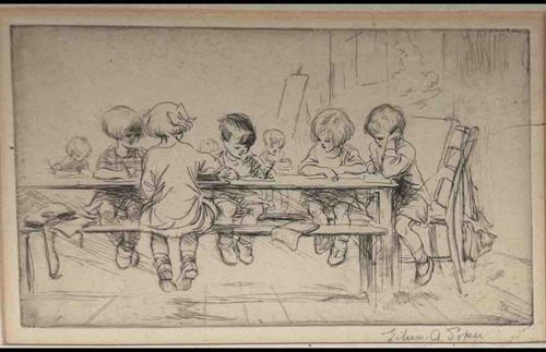 Eileen A. Soper Signed Etching of Children in a Classroom