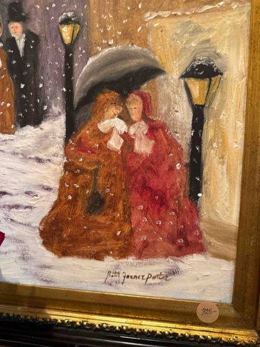This is an original oil painting on canvas or board, executed in a charming folk-art or naive style, signed by the artist Beth Joiner Porter. The scene depicts a nostalgic winter evening featuring two young girls in heavy Victorian-style coats (one brown, one red) with white bows, standing under a dark umbrella amidst falling snow. In the background, a man in a black coat and top hat is visible, alongside black lamp posts with warm yellow light. The painting utilizes heavy impasto techniques, particularly visible in the white snow and the highlights of the clothing, creating a tactile texture. The color palette is dominated by warm earth tones and reds against a cool, snowy ground with purplish shadows. The work is housed in an ornate gold-gilded frame with beaded detailing along the inner lip. Condition-wise, the paint surface appears stable with some inevitable surface dust; the frame shows minor age-appropriate wear and a circular price or lot sticker '325-' on the lower right corner. The artist's signature is clearly legible in the center foreground, suggesting a mid-to-late 20th-century creation date based on style and material appearance.
