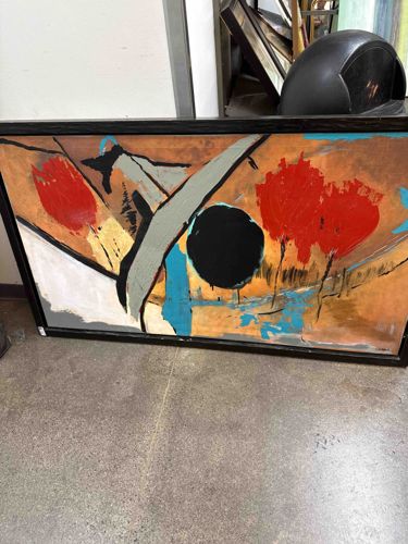 This item is a large-format abstract expressionist painting on canvas, signed by the artist C. Carlier in the lower right corner. The composition features a bold, mid-century modern aesthetic characterized by organic and geometric shapes. Dominant colors include vibrant red masses resembling floral forms or trees, a central solid black orb, and various swatches of turquoise, ochre, grey, and white. The application of paint appears both thick and gestural, with visible brushstrokes and impasto techniques that provide a textured surface. The piece is housed in a simple, linear black wooden frame that suggests a late 20th-century origin. The artwork exhibits several angular black lines that create a sense of movement across the horizontal plane. While the central focus is non-representational, the arrangement suggests a stylized landscape or celestial scene. The condition appears to be generally good, though there is a small white tag or sticker on the lower left of the frame edge, possibly an auction or inventory marker. The craftsmanship reflects a confident use of color theory and balanced negative space typical of 1960s or 1970s interior-focused fine art.
