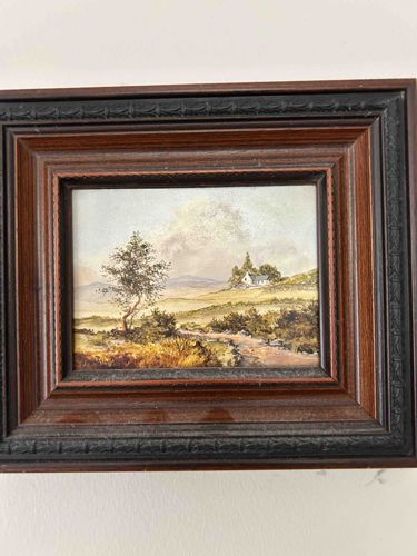 This item is a small-scale, horizontal landscape painting, likely rendered in watercolor or gouache on paper or fine card. The composition features a pastoral scene with a prominent deciduous tree in the left mid-ground, a winding path leading toward a white-walled cottage nestled on a hillside, and several rolling hills in the distant background under a soft, clouded sky. The palette consists of earthy greens, browns, ochres, and muted blues. The artwork is housed in a substantial, multi-layered wooden or resin frame with a dark brown finish and black decorative banding. The frame features a classic egg-and-dart or similar foliate molding on the outer and inner borders, which suggests a traditional or revivalist style. Based on the aesthetic and framing, the piece likely dates from the late 19th to mid-20th century. The craftsmanship is of good decorative quality, showing fine brushwork in the foliage and subtle atmospheric perspective in the hills. Visible condition issues include minor dust accumulation on the inner frame ledge and slight scuffing on the outer corners of the frame. There are no obvious signatures visible in the current view, which is common for miniature works often sold as part of sets or for decorative purposes.