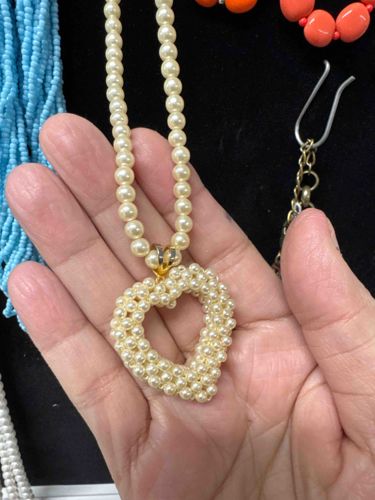 This item is a vintage-style costume jewelry necklace featuring a prominent open-heart pendant. The piece is constructed entirely from cream-colored faux pearls with a lustrous, iridescent finish. The heart pendant itself is intricately crafted using a woven or beaded three-dimensional technique, where small, uniform faux pearls are clustered together to form the heart shape. This pendant is suspended from a single strand of larger, matching faux pearls. The attachment point between the pendant and the strand features a small gold-tone metal bail, which suggests a mid-to-late 20th-century manufacturing style, likely from the 1980s or 1990s. The pearls exhibit a warm, ivory-tone patina consistent with aged costume materials. Upon close inspection, the condition appears fair to good; there are no immediate signs of significant peeling or nacre loss on the pearls, although some light surface wear and minor metal discoloration on the gold-tone bail are visible. The craftsmanship demonstrates a classic romantic aesthetic often found in bridge or boutique fashion jewelry. The strand is hand-strung, though no complex knotting is visible between the individual pearls, which is typical for items of this manufacturing level.