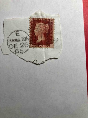 This item is a 19th-century British postage stamp, commonly known as a 'Penny Red,' still adhered to a fragment of the original cream-colored paper envelope (on-piece). The stamp features the profile of Queen Victoria facing left, rendered in a brownish-red or brick-red ink. It is perforated along all four edges, though the perforations show some minor irregularities and wear. Notable markings include the check letters 'D' and 'Q' in the upper corners and 'Q' and 'D' in the lower corners, which were used to identify the stamp's position on the printing plate. To the left of the stamp is a clear, circular black ink handstamp cancellation, or postmark, reading 'HAMILTON' at the top, 'DE 26' in the center, and '65' at the bottom, indicating it was processed in Hamilton (likely Scotland or Ontario, Canada, given the British Empire usage) on December 26, 1865. The paper fragment is irregularly torn with significant creasing and vertical folds that pass through the stamp itself. There are light pencil marks or notations to the right of the stamp. The stamp's surface shows evidence of use and aging, with some fading and surface accumulation, but the engine-turned background design remains visible, indicating the high-quality line-engraving process used by Perkins, Bacon & Co. during this era.