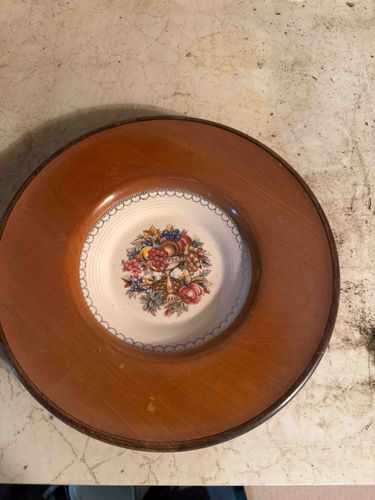 This is a vintage circular serving bowl, approximately 10 to 12 inches in diameter, featuring a composite construction of turned wood and glazed ceramic. The outer body is fashioned from a warm, medium-toned wood, likely mahogany or cherry, with a wide, flared rim and a smooth, polished finish. Set into the center of the bowl is a circular ceramic medallion or plate featuring a transfer-ware still life of a cornucopia or fruit basket. The central motif displays a rich palette of deep reds, purples, and yellows, depicting grapes, apples, and pears, bordered by a delicate black scalloped or lace-like pattern on a cream-colored ground. The wooden portion shows visible signs of age and use, including light surface scratches, some finish wear on the rim, and a few small pale spots where the lacquer has been compromised. The ceramic center appears intact without visible crazing or chips from this angle. This style of decorative functional ware was highly popular in the mid-20th century (circa 1950s-1960s), often used as a nut bowl or fruit dish. Similar pieces were frequently produced by American companies like Red Wing or Vernon Kilns, though no maker's mark is visible here. The craftsmanship is solid, representative of high-quality mass-produced American kitchenware of the post-war era.