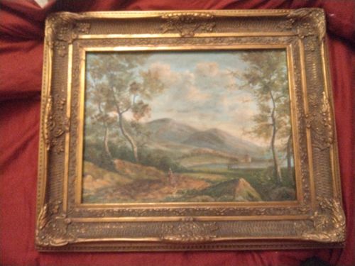 This item is an original oil painting on canvas or board, depicting a classic pastoral landscape, housed in a highly ornate, gilded composition and wood frame. The scene features a rolling mountainous background under a soft blue sky with cumulus clouds, framed by deciduous trees in the foreground. A small figure appears to be traversing a path in the center-left, leading toward a distant body of water and a structure, possibly a cottage or castle. The color palette consists of naturalistic earth tones, greens, and ochres, characteristic of late 19th-century academic or provincial landscape styles. The frame is a significant feature, displaying elaborate rococo-revival motifs including acanthus leaf corners, floral swags on the rails, and cross-hatched basketweave patterns in the coved sections. The gilding shows a rich, aged patina with some minor darkening in the recesses. Condition-wise, the frame appears to have small chips and visible cracking (craquelure) consistent with age-related desiccation of the gesso. The painting surface shows a slight yellowing of the varnish, which is typical for its estimated age from the 1880s to early 1900s. There are no immediately visible signatures or maker's marks, though such details are often obscured by the frame lip or found on the reverse. The craftsmanship of the frame suggests a moderately high-quality commercial production from the Victorian or Edwardian era, designed to enhance the traditional aesthetic of the artwork.