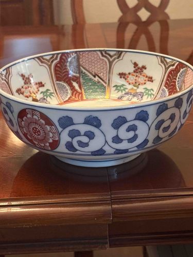 This is a medium-sized Japanese Imari porcelain bowl, likely dating from the Meiji period (late 19th to early 20th century). The bowl features a classic polychrome design combining underglaze blue with overglaze enamels in iron-red, green, and gold gilding. The exterior is decorated with large, swirling cobalt blue 'karakusa' (scrolling vine) patterns intermittent with circular red floral medallions. The interior is richly ornamented with radiating panels depicting various floral motifs, including chrysanthemums and plum blossoms, separated by geometric patterns and gold-lined borders. The piece is constructed from fine white porcelain with a slight blueish tint to the glaze. A double indigo ring is visible around the inner and outer rim. There is some noticeable wear to the gold gilding on the interior panels, consistent with age and occasional use. The footring appears well-defined with minor kiln grit or shelf wear. No major cracks, chips, or structural repairs are immediately visible in the image, suggesting the piece has been well-maintained. The craftsmanship is highly detailed, characteristic of the export porcelain produced in the Arita region.