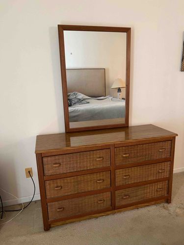 Mid-Century Style Rattan and Oak Six-Drawer Dresser with Matching Mirror