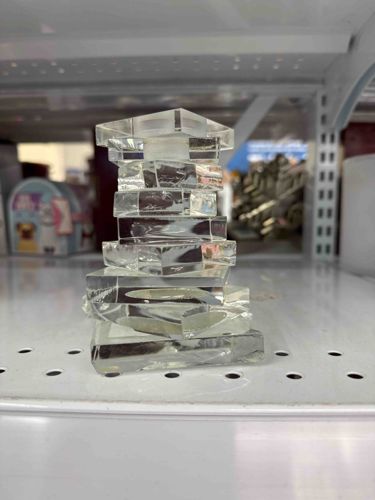 This is a contemporary-style candlestick holder constructed from multiple irregularly stacked glass or lead crystal geometric slabs. The piece features approximately seven to eight horizontal levels of thick, clear transparent material, likely glass or acrylic, though the light refraction suggests a higher density glass or crystal. Each level consists of a rectangular or hexagonal flat plate with beveled edges, stacked in an offset or 'jumbled' vertical alignment to create a dynamic, sculptural silhouette. The top of the object features a recessed circular well specifically designed to hold a standard taper candle. Physically, the item appears to be roughly 6 to 8 inches in height. The clear material shows significant internal clarity with minimal visible bubbling, indicating a molded or machine-cut manufacturing process rather than hand-blown techniques. While there are no visible maker's marks or signatures in the photograph, the style is reminiscent of mid-to-late 20th-century modernist decor or contemporary boutique homewares. In terms of condition, there is visible edge wear, including small nicks and 'flea bites' along the sharp beveled corners of the glass slabs, and a light accumulation of surface dust. The base appears stable, though its asymmetrical design is purely aesthetic.