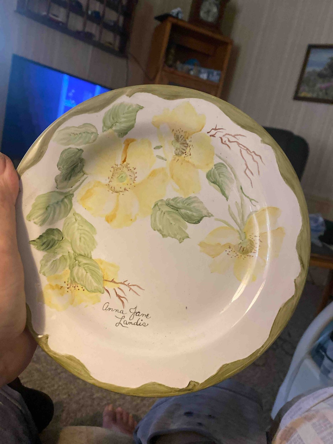 This is a circular ceramic collector's plate featuring a hand-painted botanical scene. The central motif consists of several large, pale yellow wild roses or similar flora, accented with sage green leaves and delicate brown thorny branches. The artistry displays a fluid, watercolor-like technique with soft shading and fine stippling detail in the centers of the blooms. The plate's rim is finished with a hand-brushed, scalloped border in a matching olive-sage green tone against a white glazed ground. Notably, the artist's signature 'Anna Jane Landis' is clearly scripted in black ink on the lower left quadrant of the plate face. The piece appears to be made of a white earthenware or porcelain base with a high-gloss clear overglaze. In terms of condition, there is a visible chip on the lower edge of the rim where the green paint has flaked away, exposing the white ceramic body underneath. There are also small dark specks (pitting or kiln debris) visible in the glaze. Based on the style and signature, this likely dates to the mid-to-late 20th century, representing a fine example of amateur or semi-professional decorative china painting which was popular in regional arts and crafts circles.
