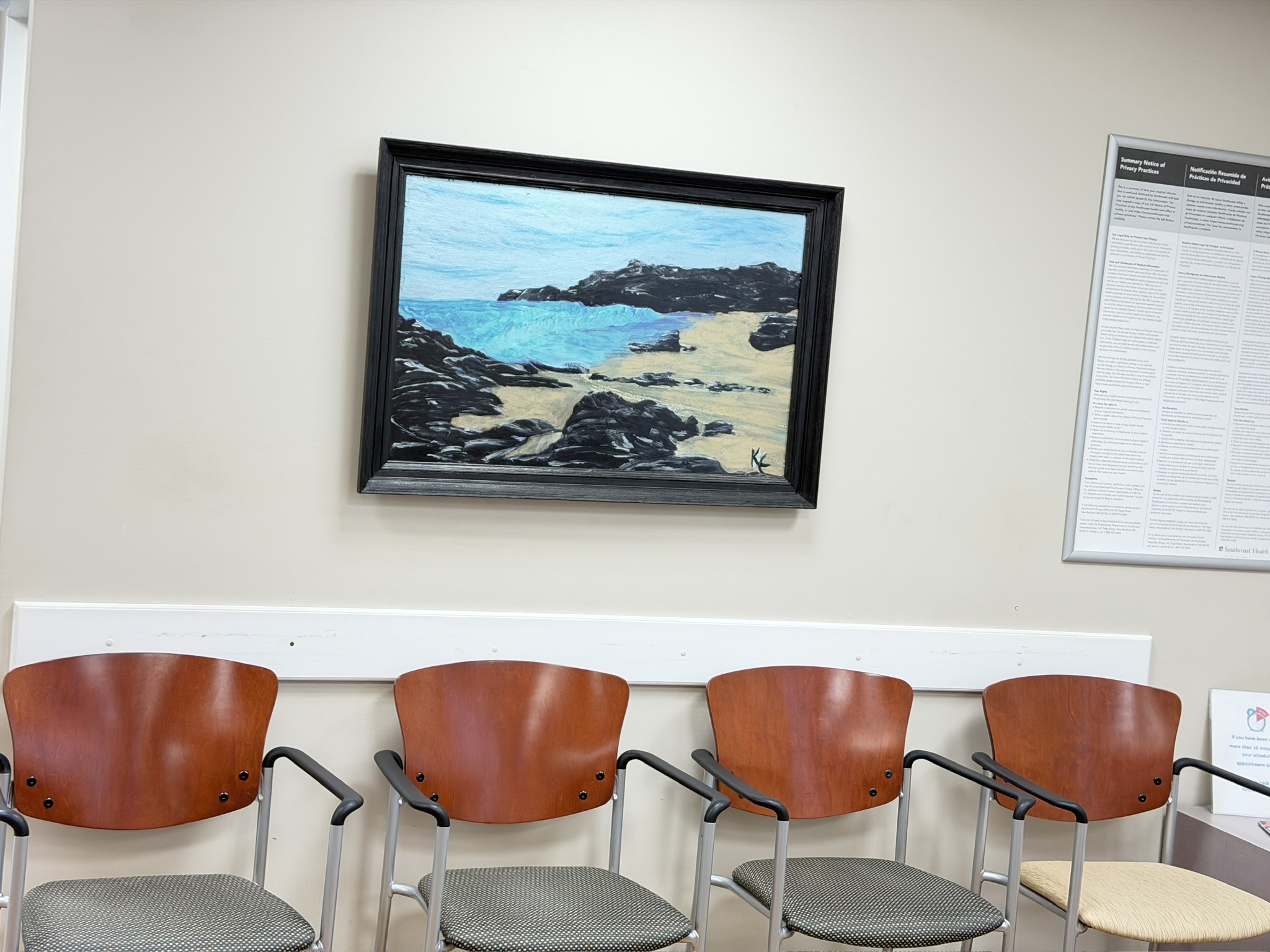 This is an original representational landscape painting depicting a rugged coastal scene, likely an oil or thick acrylic on canvas or board. The composition features a turquoise shoreline crashing against dark, jagged basalt-like rock formations and a tan sandy beach under a light blue sky. The painting style is expressive and impasto-heavy, with visible, textured brushstrokes particularly in the sky and white-capped waves. The work is signed with the initials 'KC' in the lower right corner. It is housed in a contemporary, tiered black wooden frame with a matte finish. Physically, the artwork appears to be a modern piece, possibly late 20th or 21st century, consistent with amateur or local artisan production. The frame shows minor signs of surface wear but remains structurally sound. The painting surface appears stable with no immediate signs of cracking or pigment loss. The color palette is dominated by cerulean, black, and ochre tones. The craftsmanship suggests a focus on texture and light rather than fine detail, resulting in a bold, atmospheric aesthetic suitable for decorative interior use.