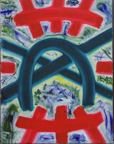 This item is an original abstract painting executed in what appears to be oil or acrylic on a vertically oriented canvas. The composition is defined by bold, gestural brushstrokes featuring a vibrant color palette of primary red, deep cerulean blue, and touches of yellow, green, and white. The central motif consists of interlocking and overlapping arched forms. Two prominent red structures resembling 'gates' or grids flank the top and bottom of the frame, characterized by thick, textured applications of paint that show visible bristle marks. A large, dark blue arch dominates the center-left, interlocking with a diagonal blue beam that creates a sense of spatial depth. The background is a mix of pale, atmospheric washes and energetic dabs of green and blue, particularly in a central cluster that suggests a landscape or focal point. The work exhibits characteristics of Abstract Expressionism or Neo-Expressionism, likely dating from the late 20th to early 21st century. The execution shows high energy with intentional overlaps where colors have mixed slightly on the canvas, indicating a wet-on-wet technique in certain areas. No visible signature or maker’s marks are discernible on the face of the painting. The corners show slight wear consistent with handling, and the edges appear unframed, revealing the raw canvas wrap which is typical of contemporary gallery-style presentation.