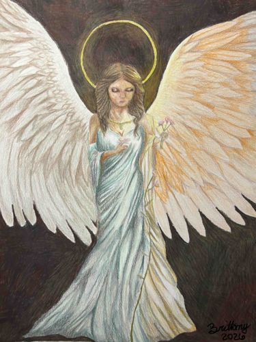 This is a contemporary figurative illustration depicting a female winged angel, rendered on what appears to be heavy-weight paper or cardstock. The medium appears to be a combination of colored pencil and possibly soft pastel or acrylic wash, characterized by visible directional strokes and layering. The central figure features floor-length flowing robes in shades of pale blue and white with gold accents, large white feathered wings with warm golden-orange highlights on the right side, and a simple golden halo. The angel is holding delicate pink flowers and wears a golden necklace. The background is a dark, textured brown that provides a high-contrast backdrop for the light-toned figure. Notable markings include a handwritten signature in the lower right corner that reads 'Brittany' above the date '2020'. The level of craftsmanship indicates a contemporary folk or amateur artistic style, focusing on symbolic religious imagery. The paper shows slight texture consistent with mixed media applications. The condition appears excellent with no visible tears, foxing, or fading, though as an unframed work, the edges may be susceptible to minor curling. The composition uses a classic celestial motif with a modern, softer color palette.