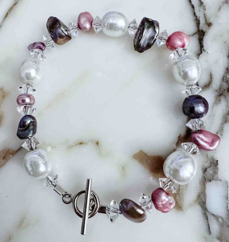 A contemporary artisan-crafted beaded bracelet featuring a diverse array of freshwater pearls and faceted glass elements. The piece is composed of irregular baroque-style pearls in varying lusters, including classic white, soft pink/mauve, and deep iridescent peacock or Tahitian-style hues. These pearls exhibit characteristic natural surface variations such as ridging and organic shaping, which provide a textured aesthetic appeal. Interspersed between the pearls are precision-cut clear Swarovski crystal bicones, which serve as spacers and add significant light refraction to the design. The construction utilizes high-quality jewelry wire terminating in sterling silver findings. A notable feature is the polished sterling silver toggle clasp, which is stamped with a subtle hallmark on the ring component. The bracelet appears to be in excellent condition with no visible chips to the crystals or significant loss of nacre on the pearls. The piece represents a late 20th or early 21st-century aesthetic, combining traditional materials with organic forms. The craftsmanship is evidenced by the consistent tension of the stringing and the high-clarity facets of the Swarovski components, resulting in a sophisticated, multi-textural accessory.