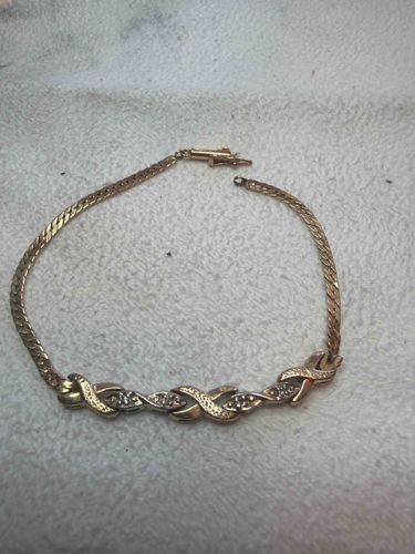 This is a vintage-style 'Hugs and Kisses' (X and O) link bracelet featuring a two-tone metal design, likely 10k or 14k gold. The central decorative section consists of interlaced polished yellow gold 'X' motifs alternating with textured or rhodium-plated white gold 'O' or marquise-shaped links. These white gold links are set with small, round-cut accent diamonds or diamond simulants. The decorative front transitions into a yellow gold flat curb or herringbone-style chain. The piece is secured with a fold-over box clasp, which appears to be in working condition but lacks a safety latch. Regarding condition, there is visible surface wear including fine scratching and minor tarnish (oxidation) typical of age and use. The construction suggests late 20th-century mass-market fine jewelry (circa 1980s-1990s). The craftsmanship is characteristic of commercial production with cast components and machine-made chain. No clear maker's marks are visible in the photograph, though they would typically be located on the clasp tongue. The metal shows a warm yellow patina, and the overall integrity of the links appears sound without significant kinking or broken solder points.