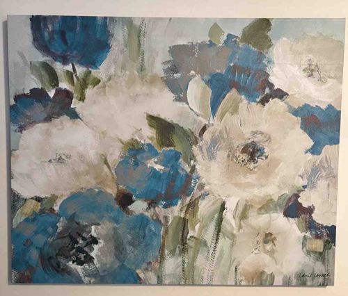 This is a contemporary abstract floral piece, likely an acrylic painting or a high-quality enhanced giclee on gallery-wrapped canvas. The composition features a dense arrangement of large, stylized flower blossoms, primarily poppies or peonies, rendered in a cool-toned palette of cerulean blue, navy, cream, white, and sage green. The artist employs an expressive, painterly style characterized by broad, visible brushstrokes and impasto-like textures that give the work a sense of movement and depth. The application of paint appears layered, with neutral taupe and gray tones peeking through the more vibrant blues. Notable features include the signature 'Carol Lovell' in the lower right corner, executed in a cursive script. As a gallery-wrapped piece, the canvas is stretched over a wooden frame without an external decorative frame, allowing the image to potentially wrap around the edges. The condition appears to be excellent with no visible signs of fading, cracking, or surface abrasions. This style is consistent with modern home decor trends from the late 20th to early 21st century, designed to provide a calm yet sophisticated aesthetic. The craftsmanship is indicative of commercial fine art production intended for professional interior design markets.