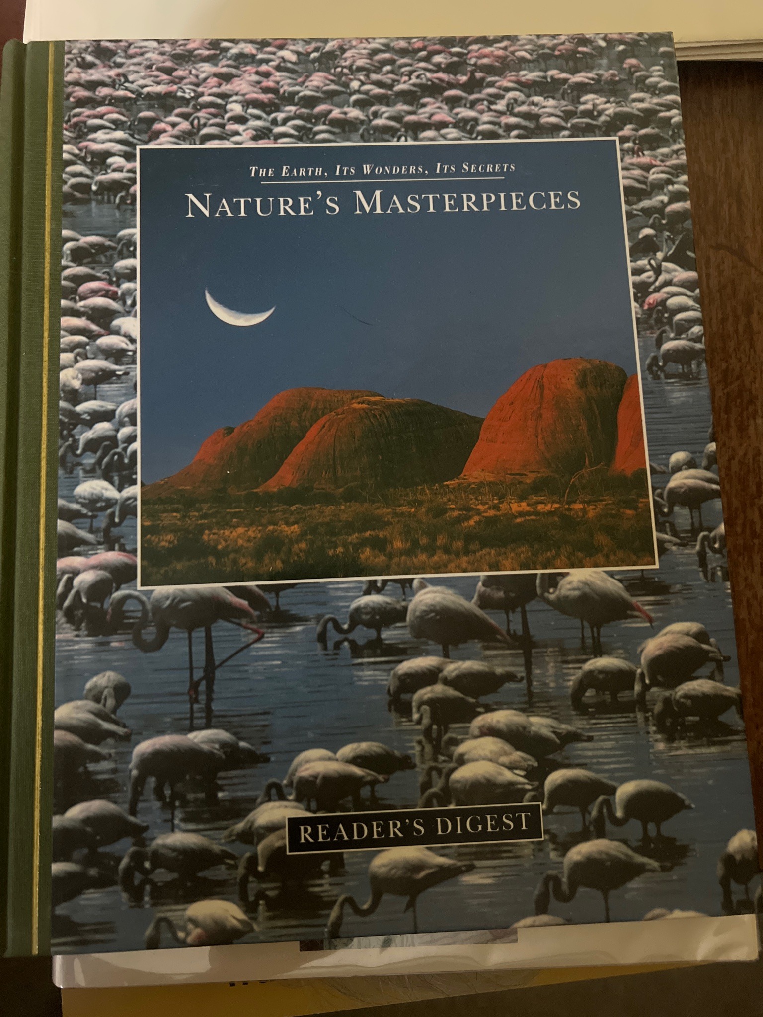 This is a large-format hardcover coffee table book published by Reader's Digest as part of 'The Earth, Its Wonders, Its Secrets' series. The cover features a full-bleed photograph of a massive flock of flamingos in a body of water. Centrally located is a rectangular inset image depicting a crescent moon over a series of dramatic red rock formations, likely Uluru or Kata Tjuta in Australia, at dusk. The title 'NATURE'S MASTERPIECES' is printed in a white, serif, capitalised font in the upper third, while the publisher's mark 'READER'S DIGEST' appears in a black box with gold outlining at the bottom. The binding shows a dark green spine with a gold-toned vertical rule. Physically, the book appears to be in good vintage condition with sharp corners and vibrant color saturation on the matte or semi-gloss finish. There are no obvious signs of significant foxing, moisture damage, or structural spine lean visible in the image. This volume is characteristic of high-quality mass-market educational publishing from the late 20th century (likely the 1990s), designed with heavy-weight paper stock and high-resolution color photography meant for display and instructional use.