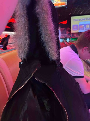This item is a modern black winter parka featuring a distinctive hood with a faux-fur trim. The exterior shell appears to be constructed from a durable, heavyweight synthetic fabric, likely a polyester or nylon blend, designed for weather resistance. The hood is lined with a long-pile, variegated grey and white synthetic fur that provides both aesthetic detail and wind protection. A prominent feature of the garment is the large, gold-toned metallic zipper that runs vertically and continues across the hood, indicating a split-hood design common in aviator-style or 'snorkel' parkas. The interior lining shows a satin-like sheen, suggesting a quilted or insulated polyester interior for heat retention. In terms of condition, the garment shows signs of light wear consistent with casual use; there is some minor matting visible on the faux-fur trim and slight tension near the zipper seams. No significant manufacturer labels or branding logos are visible in the outward-facing shot, but the heavy-duty hardware and thick stitching suggest a mid-to-high-level mass-market quality. The style is contemporary, likely produced within the last 5 to 10 years, and belongs to the 'utility-chic' outerwear trend seen in brands like Moose Knuckles, Canada Goose, or high-end fast fashion labels.